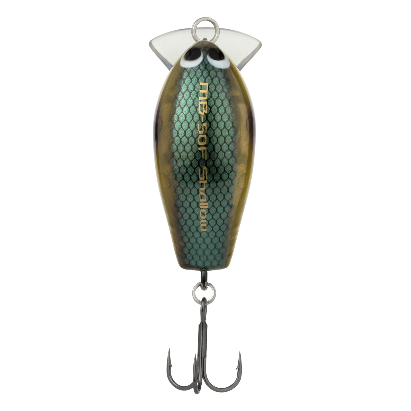 The combination of a Hybrid Edge round bill, strong buoyancy, and fixed one-piece weight construction make the Macbeth Shallow 50F the perfect crankbait for sub-surface cranking in depths just under one foot. Shimano engineers designed the Hybrid Edge round bill to achieve a fast and fish-enticing swimming action with the durability to withstand punishing contact with cover. The wide round bill on the MB-50F Shallow protects the front hook while reeling through cover, while the thick-diameter rear hook will not deform easily when hitting unexpected obstacles and adds durability during tough fights with trophies. The unique one-piece weight within the Macbeth Shallow concentrates the center of gravity and allows the lure to recover quicker after making contact with cover while enticing aggressive reaction bites.